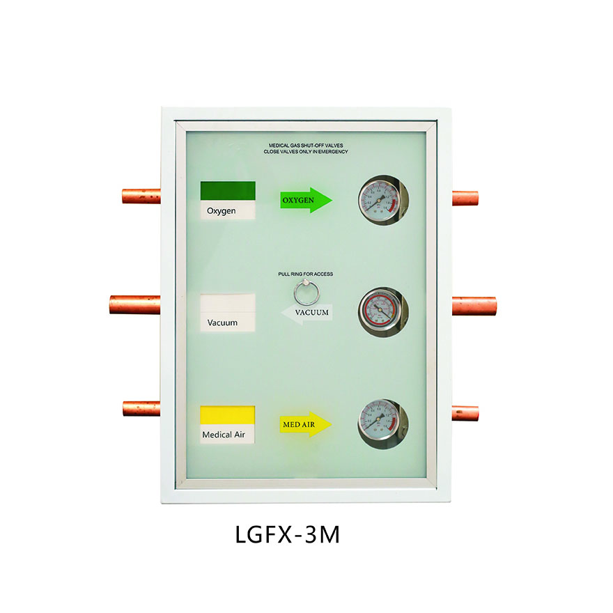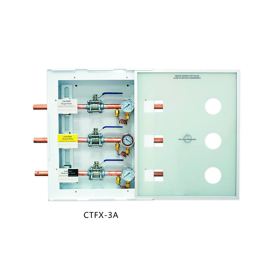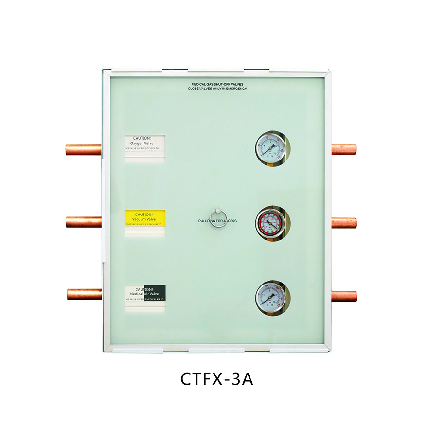 Weclearmed®Zóna ventilu lékařského plynuse používá pro monitorování plynu, často používané v nemocnicích, kde zdravotnický personál kontroluje průtok plynu na každém oddělení.Zóna ventilu lékařského plynuje ventilová krabice pro oblast lékařského plynu včetně krabice, dveří, zámku a alespoň jedné ventilové sady. Každá ventilová sada obsahuje sekvenčně připojené vstupní potrubí, ventil, mezilehlé potrubí, barometr a výstupní potrubí. Přední konec těla krabice je opatřen portem pro údržbu a dvířka boxu lze otevřít a zavřít portem pro údržbu.
