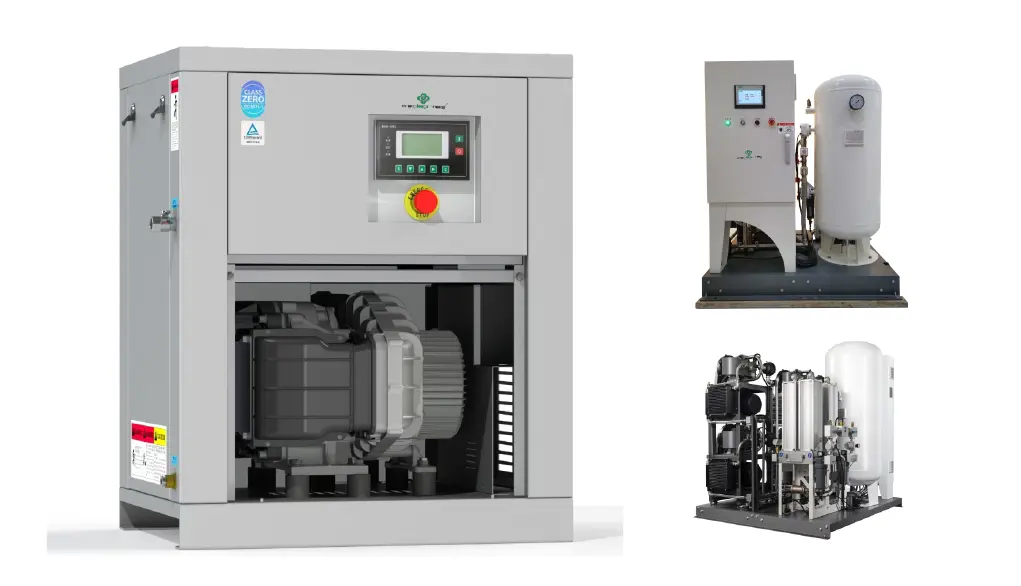 Běžně používaná komprese vzduchu pro lékařské aplikace jsou svitky bez oleje bez oleje, kompresory vzduchu bez šroubu bez oleje, mikro-olejové nebo olejové pístové kompresory atd. Kromě vzduchového kompresoru systém obvykle obsahuje chladiče, sušičky, filtry, nádrže a monitorovací zařízení, jako je monitorování rosných bodů a monitorování CO.
